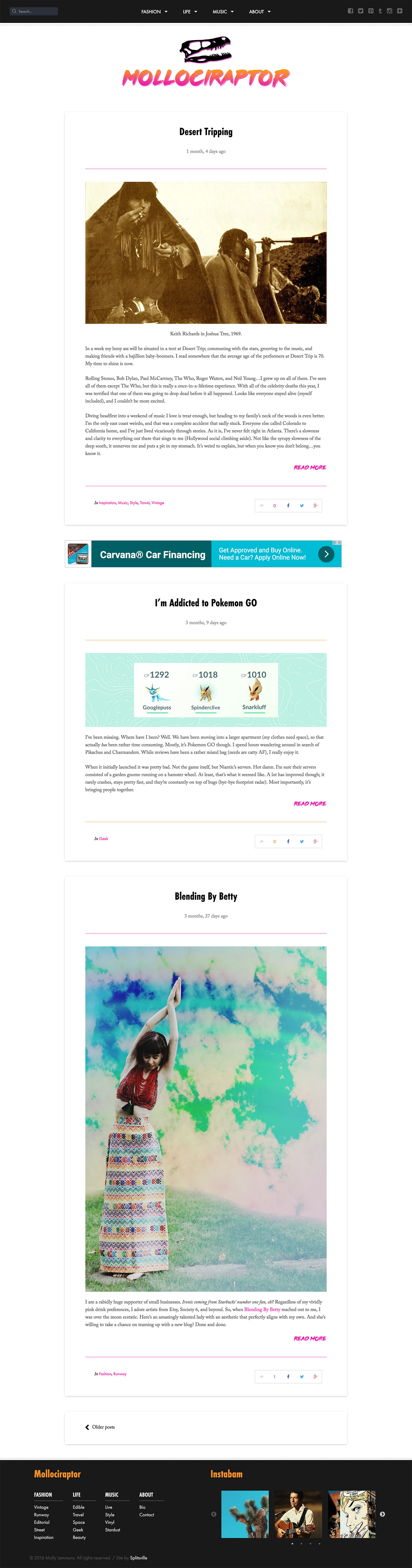 Mollociraptor is a blog about fashion, comic books, literature, the occult—all the swirling, fantastical thoughts of the influencer Molly Lemmons. Her collaborations with international brands attract thousands of followers, and she's a veritable social media icon. I designed her logo and Wordpress theme, which includes a custom widget for displaying her latest Instagram posts, a custom social media sharing plugin, and a custom "shy" navbar javascript implementation—bashful navigation that appears when you need it.