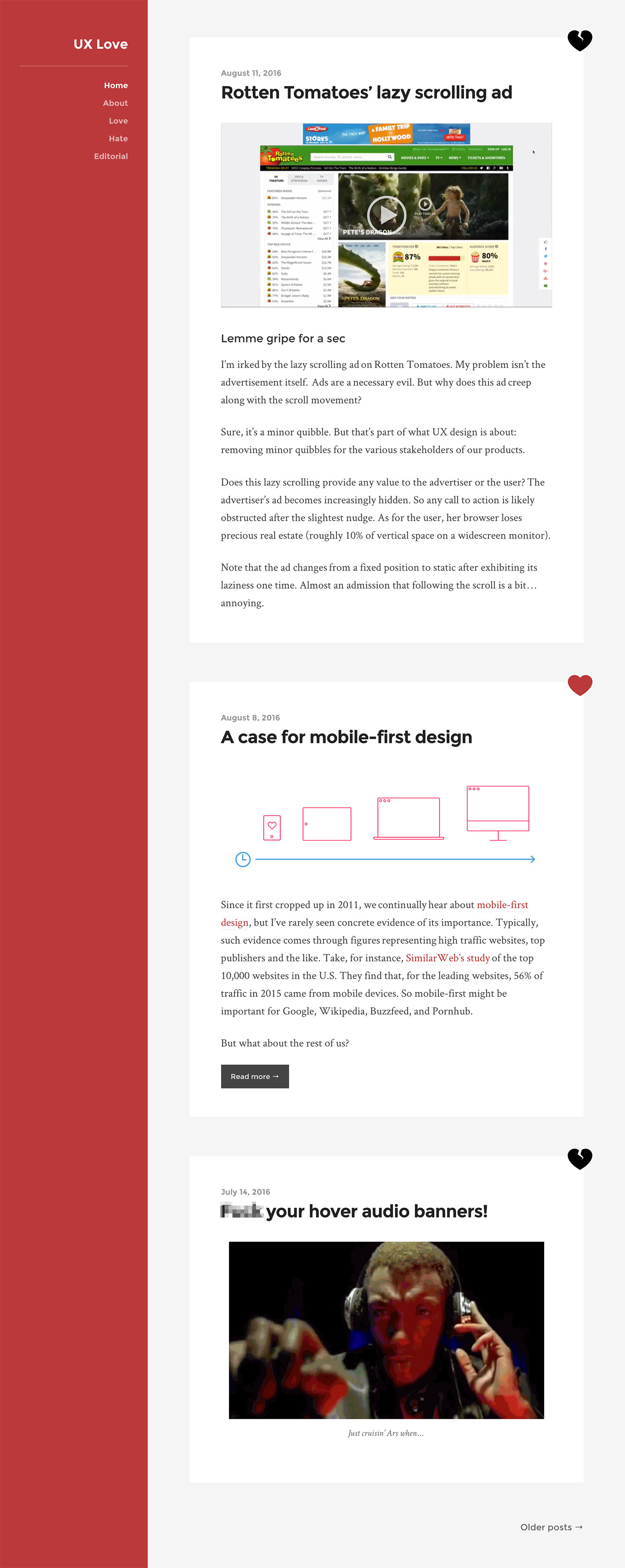 UX Love was a blog about user experience design, both good and bad. I collected and analyzed examples of UX from web, desktop, mobile apps, and seen in the wild. The blog was a community for designers, developers, researchers, and anyone else who understood what the magical pairing of the letters U and X signifies.
